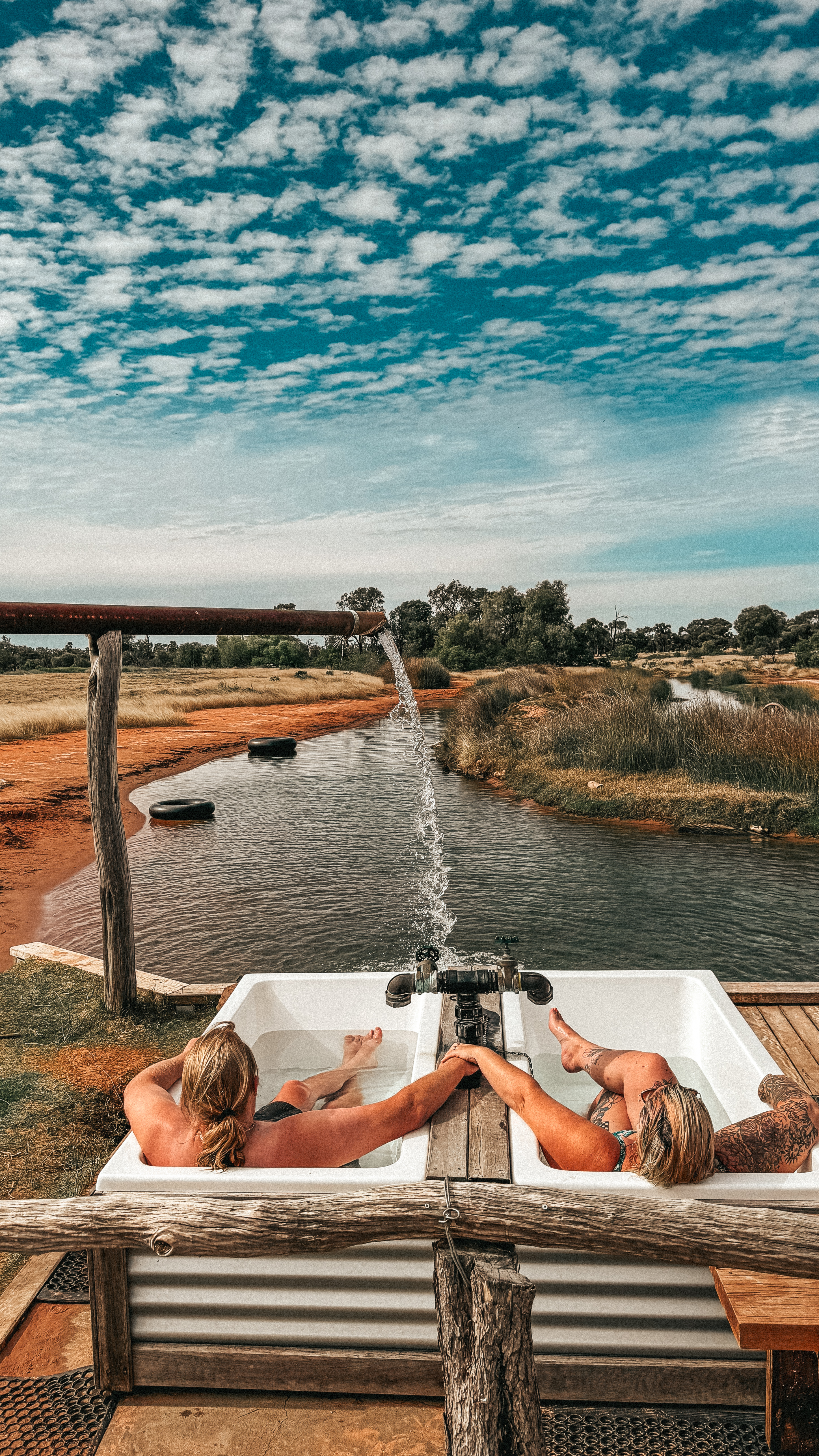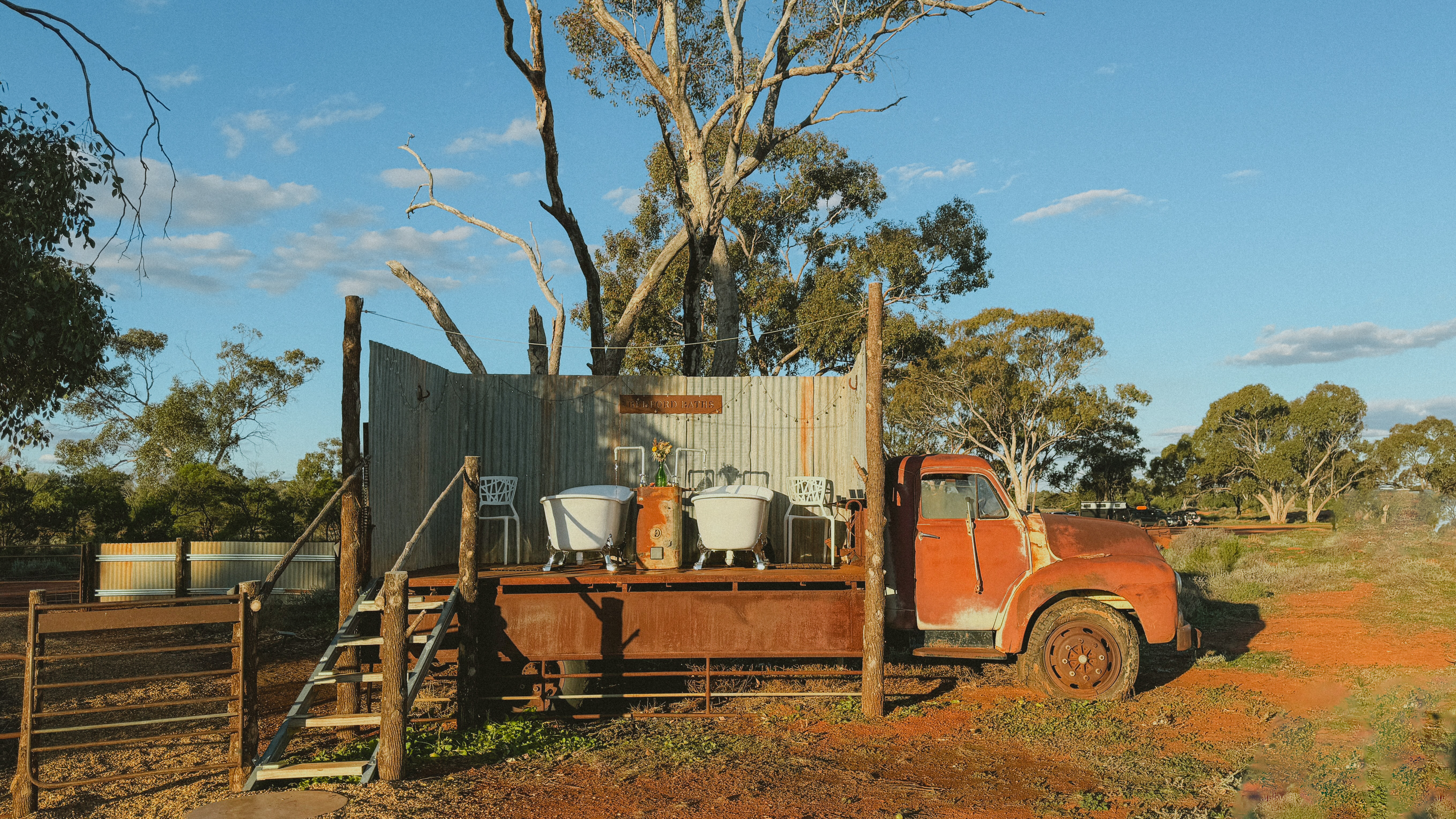 Fri 27th June – Stayed at Meralda Station in Cobar. We booked 2 nights in their retro on-site van. There was no heating or cooling in the van, so we froze overnight. The stay was still fantastic though. The amenities were very unique, rustic, lots of character. I’ll share some photos below. On the first night we enjoyed a campfire meal, with the produce supplied by the station. It was amazing! The hosts prepare it all, and supply all the cooking utensils, camp oven, and plates etc. and you cook ir yourself on your camp fire. So good! On the second night the 4 of us enjoyed a sunset bath in the Bedford Bathhouse, with some drinks and nibbles. Absolutely beautiful!!